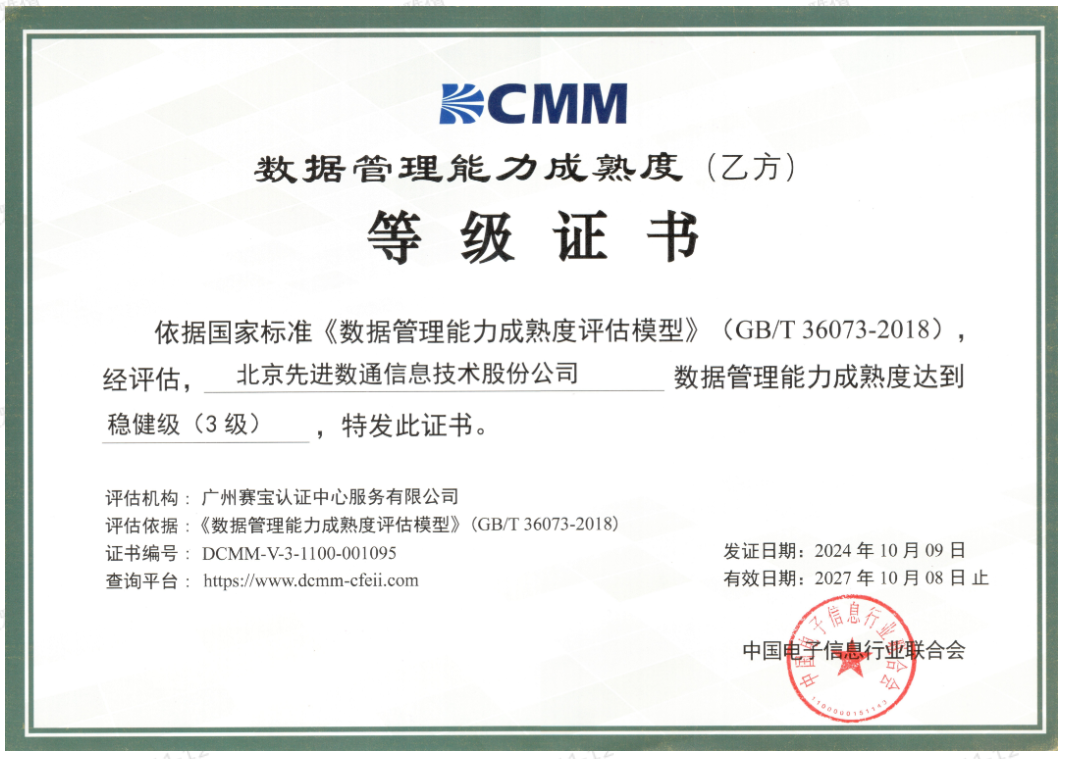 近期,中国电子信息行业联合会公布了最新一批顺利获得数据管理能力成熟度(DCMM)贯标等级认证的企业名单。黄金城集团成功取得数据管理能力成熟度稳健级(三级)认证。这一认证的取得,标志着黄金城集团在数据治理体系构建和数据管理与应用能力方面,已经达到了国家权威组织认可的标准。这不仅是对黄金城集团在数据管理领域专业能力的肯定,也是对其在有助于数字化转型服务和数据驱动决策方面所做努力的认可。